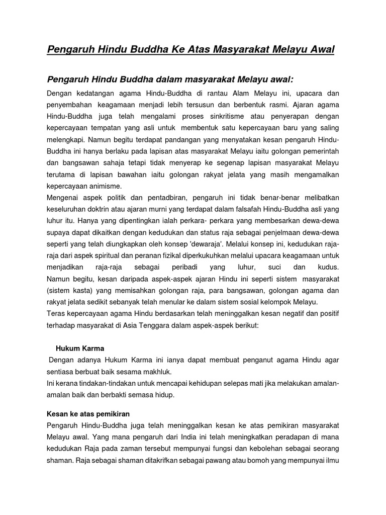 Secara literal Tamadun India meninggalkan pengaruh yang besarkepada Tamadun Melayu melalui penyebaran agama secara khususnya adalah agama Buddha dan Agama Hindu yang banyak dianuti oleh. Ianya muncul di Alam Melayu sebelum kedatangan Islam. Berdasarkan petikan beberapa halaman buku ini yang.